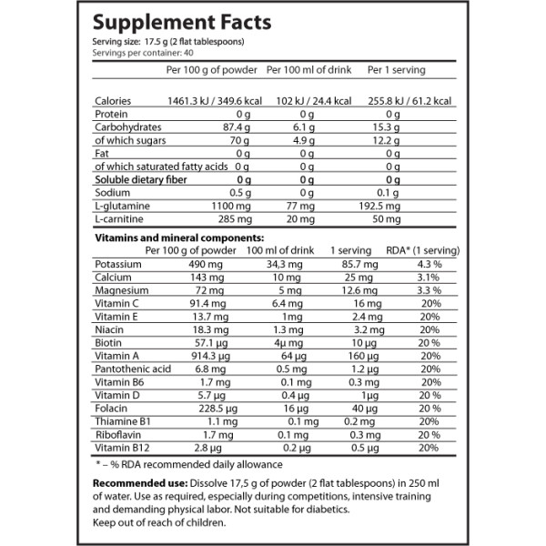 Состав ISO Plus Powder включает простые углеводы, L-карнитин, L-глютамин, а также минеральный комплекс с магнием, натрием, калием и кальцием. Витаминно-минеральная смесь, входящая в состав продукта, обеспечивает поддержание высоких показателей физической работоспособности и укрепление иммунной системы организма.