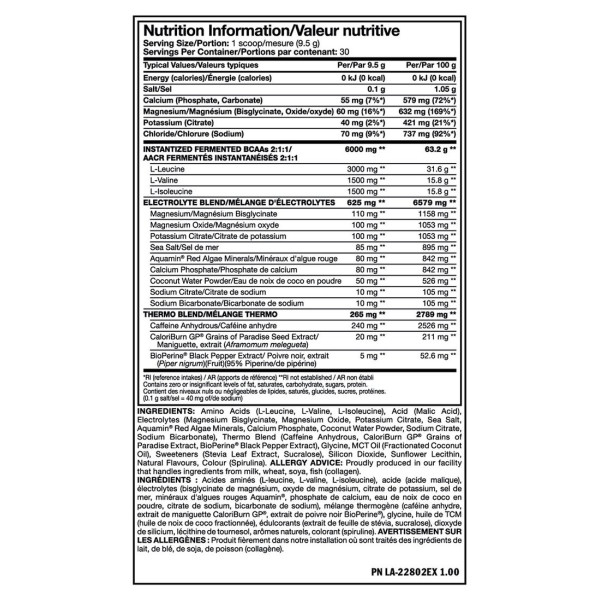 Boshqa tarkibiy qismlarga aminokislotalar (L-leysin, L-valin, L-izoleysin), kislotalar (limon kislotasi, olma kislotasi), elektrolitlar (magniy bisglisinat, magniy oksidi, kaliy sitrat, dengiz tuzi, suvdagi qizil suv o'tlari minerallari, kaltsiy fosfati) kiradi. kukun hindiston yong'og'i suvi, natriy sitrat, natriy bikarbonat), termo qorishma (suvsiz kofein, CaloriBurn GP donalari jannat ekstrakti, BioPerine® qora qalampir ekstrakti), glitsin, MCT yog'i (fraksiyalangan hindiston yong'og'i yog'i), tatlandırıcılar (stevia ekstrakti), sukra kremniy, kungaboqar lesitini, tabiiy tatlar va rang (qizil lavlagi kukuni).