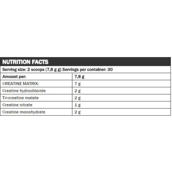 Kreatin matritsasi monohidrat, gidroxlorid, malat va nitratni o'z ichiga oladi. Har bir shaklning o'ziga xos afzalliklari bor, masalan, eruvchanlikni oshirish, so'rilishni yaxshilash va oshqozonda noqulaylik yo'qligi.